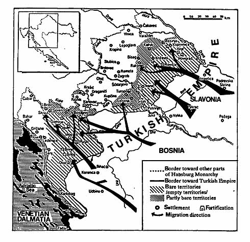 The greater portion of the ethnic area of the Serb on the territory of the former SR of Croatia was settled by the Serbs from the 15th century to the 19th, at the time of the Turkish-Hungarian, Turkish-Austria and Turkish-Venetian wars. Mass shifting of the people of the Serbo-Croat linguistic provenance took place because of the Turkish conquests on the Balkan peninsula Mass organised and unorganised migrations and flights of the Orthodox and Catholic populations followed. The movements of the population were mostly directed north, north-west, west and south-west (to the Adriatic littoral) They fled from the Turks and moved along with them. In the war zone (north-western Dalmatia, Lika, Kordun, Banija, Slavonija), vast regions became completely or almost completely deserted. In the mid 16th century, the Curia Romana proclaimed Knin and the Krajina to be the in partibus infidelium country since there was not a single Latin church or any Catholics left.[15] The Turks settled the Orthodox and the newly Islamized population there for economic and security reasons. The Orthodox (Serbian) people were also settled on the other side of the border (Hungary, Austria, Venetian Republic) for the same reasons. These people were called frontiersmen. The Military Bolder or Military Frontier was formed in the Balkans and in the Danube Basin (from the Adriatic to the Carpathians) along the Turkish border It was abolished in 1873, that is, in 1881 when Turkey no longer presented a danger.
