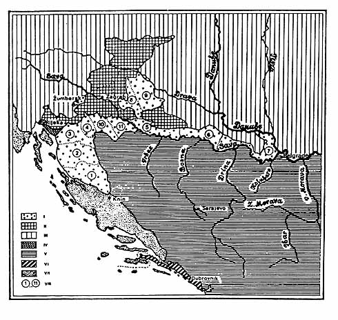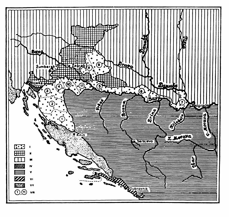I - Military border under Austrian administartion. II - Zagreb area. III - Austria and Hungary. IV - Hungarian Littoral. V - Turkey. VI - Dubrovnik Republic. VII - Venetian Republic. VIII - The Military border regiments: 1. Lički. 2. Otočki. 3. Ogulinski. 4. Slunjski. 5. Gradiški. 6. Brodski. 7. Petrovaradinski. 8. Križevački. 9. Đurđevački. 10. Glinski. 11. Petrinjski. (Source: Mile Nedeljković, Note 21)
