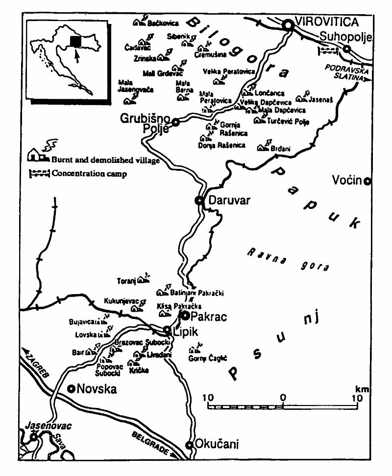 The second Serbian region is situated in Western Slavonija, Moslavina, and Bilogora. This compact territory in which the Serbs are ethnically predominant is around Okučani and Pakrac, on the slopes of Psunj and Papuk mountains. Pakrac is the spiritual and political centre of the region. By the 1981 and 1991 censuses the Serbs had relative majority in the municipality of Pakrac and in 1981 in the municipality of Daruvar, too. Together with the Yugoslavs they had relative majority in the municipality of Grubišno Polje in 1981. There were 283 Serbian settlements in this part of the RSK and Croatia in 1981. Unfortunately, many of these settlements were destroyed by the Croatian pro-Ustashi army in the anti-Serbian war which started in 1991.