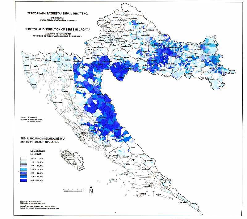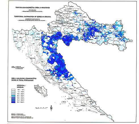 There is also a large number of settlements in the former SR of Croatia in which the Serbs have considerable shares, but not relative majority (25.1-50.0%); small shares (10.1-25.0%); and very small shares (less than 10%). Big towns and industrial centres (Zagreb, Rijeka, Split, Zadar, Pula, Osijek, etc.) belong to this group. The attached map shows that the Serbs, if small and very small shares are also taken into consideration, are distributed almost all over the territory of Croatia.